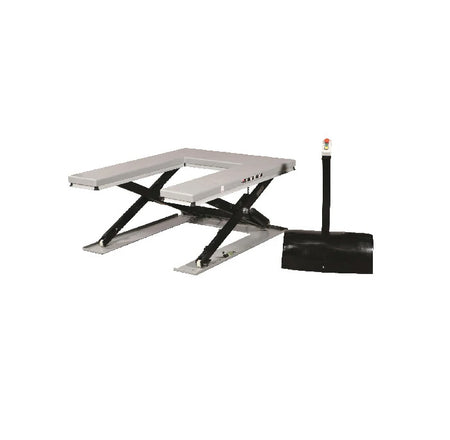 Statisk elektrohydraulisk U-formet løftebord er specielt fremstillet til pallehåndtering sammen med almindelige håndløftevogne. Installation kræver ikke rampe eller grav. Sænket højde er kun 85 mm. Bygget med solide stålplader for højeste styrke og pålidelighed. Separat hydraulisk kraftpakke (IP54), som er placeret ved siden af løftebordet. Kabel til 3-faset tilslutning 380V/16 Ah. Overholder EN1570-1 og ANSI/ASME-normer. Indvendig gaffellængde 1080 mm.